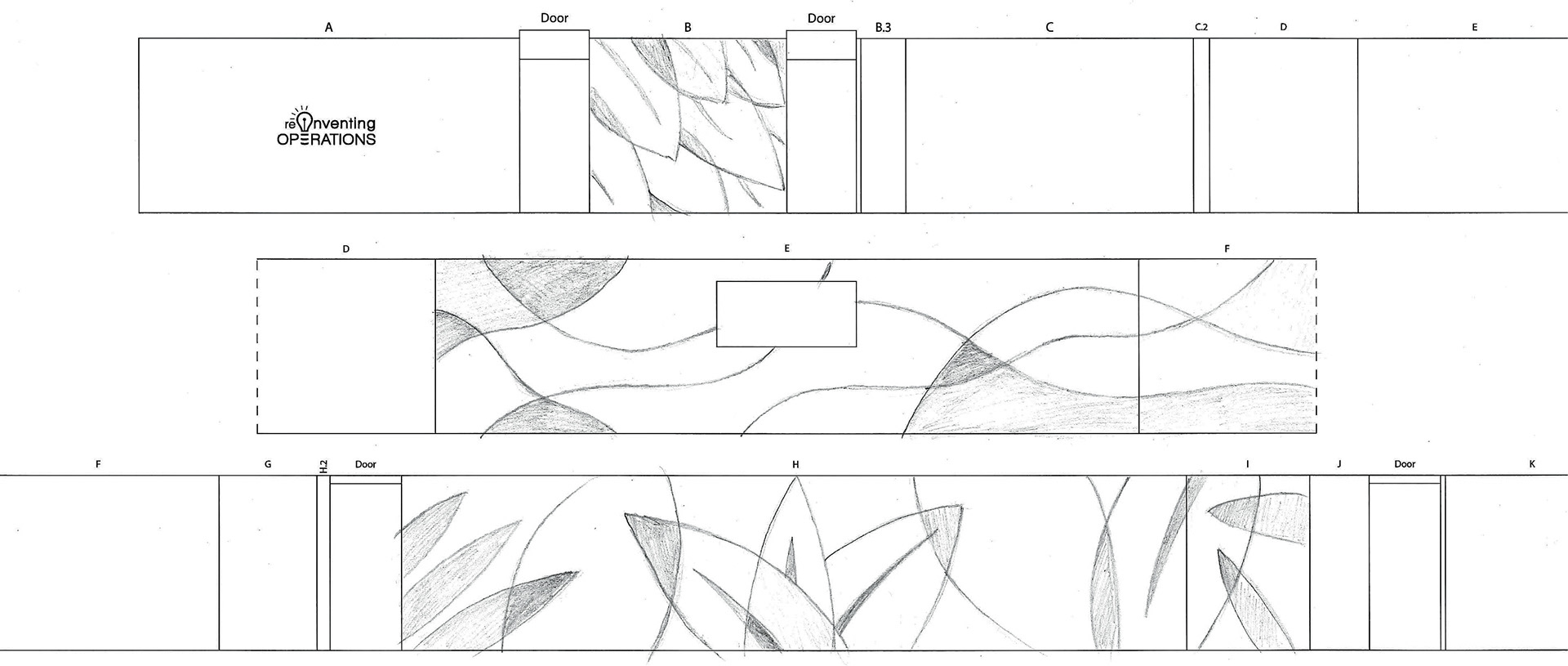 RIO was a new department that focused on creative ways to improve operations processes. The new team’s office area is a dark corner with no windows. I created wall graphics that would bring light, energy, and inspire the team to think creatively.